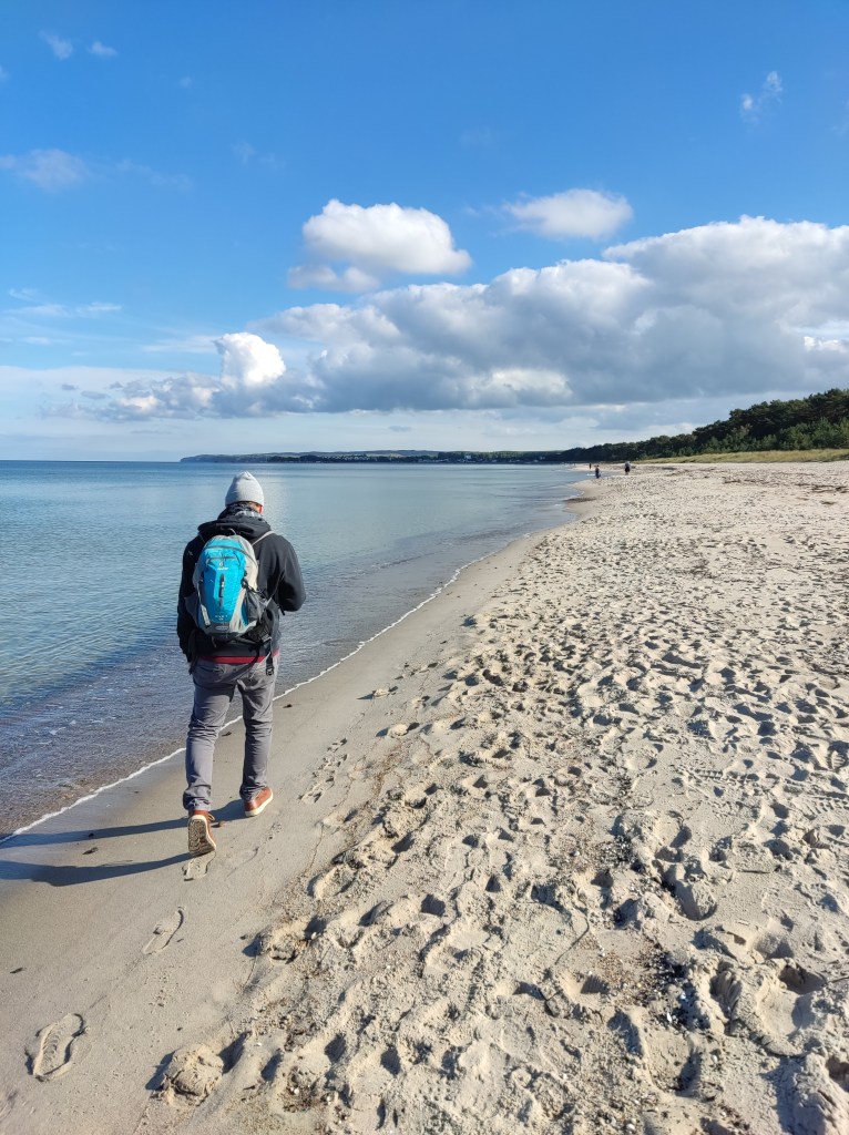 Der erste Tag auf der wunderschönen Insel gibt den Vibe der restlichen Tage vor. Eine Art mystische Dankbarkeit für die Welt stellt sich in uns ein. Wir werden demütig ob unserer kleinen Leben, die wir hier führen im Großen Ganzen. Und das tut uns so richtig gut – uns neurotischen Städtern, ausgebrannt von endlosen Lockdowns und miesen Aussichten für die Zukunft. Nach dem ersten Regentag haben wir nur noch Sonnenschein und wir sind überall auf der Insel unterwegs. Wir haben hier genau das gefunden, was wir gesucht haben: ein bisschen Einsamkeit und leere Strände. Die wunderbare Ostsee im Herbst. Es riecht nach Meer und überreifem Fallobst, Most und frischem Räucherfisch. Von überall hören wir die Vögel rufen, mal einen Trecker übers Feld fahren.